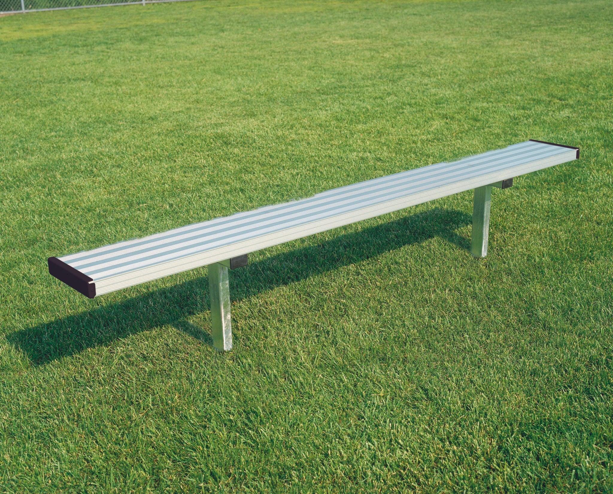 Benches are available as either in-ground fixed models or wide-base, freestanding portables…but these benches do not have a backrest • Bison player benches have 100% welded aluminum support structure • 21' length for fourteen player capacity, 15' for ten players or 7½' for five players • Four 2" square supports on 21', three supports on 15' and two supports on 7½' • 2" x 10" x .08" minimum cross section anodized aluminum seats and backs • Planks have end caps for a finished look without sharp edges • Fixed models require a 30" concrete footing to install in-ground for lasting, safe, weatherproof seating • Portable models are constructed to provide a nearly tip-proof bench to transfer from football field to soccer, baseball or softball fields as seasons change • Portable benches can be used with or without rubber feet provided, can be anchored to ground or can be bolted down to courtside surfaces • Upgrade to color powder coated planks (see BL07SEAT1 for 7-1/2' plank options or BL15SEAT1 for 15' plank options) • Five-year limited warranty on structure, two-year limited warranty on all seats and backs
