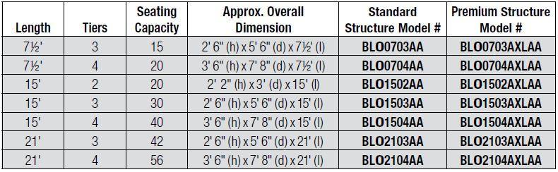 These outdoor bleachers are built for a lifetime of dependable, trouble-free sports seating…Weatherbeater bleachers come with recycled plastic ground runners to keep support framework raised from grass or dirt • Recycled runners will not rot like wood runners used by other manufacturers • Available in 7½', 15' or 21' lengths in either 3 or 4 tier heights • 2 tier bleachers are only available in 15' lengths • Heavy-duty 2" x 10" anodized aluminum seat planks • 100% aluminum welded support structures • Planks have end caps for a finished look without sharp edges • High grade zinc plated hardware • Add color planks at an additional cost to customize your field (see BL07SEAT1 for 7-1/2' plank options or BL15SEAT1 for 15' plank options) • Five-year limited warranty on structure, two-year limited warranty on planks.
