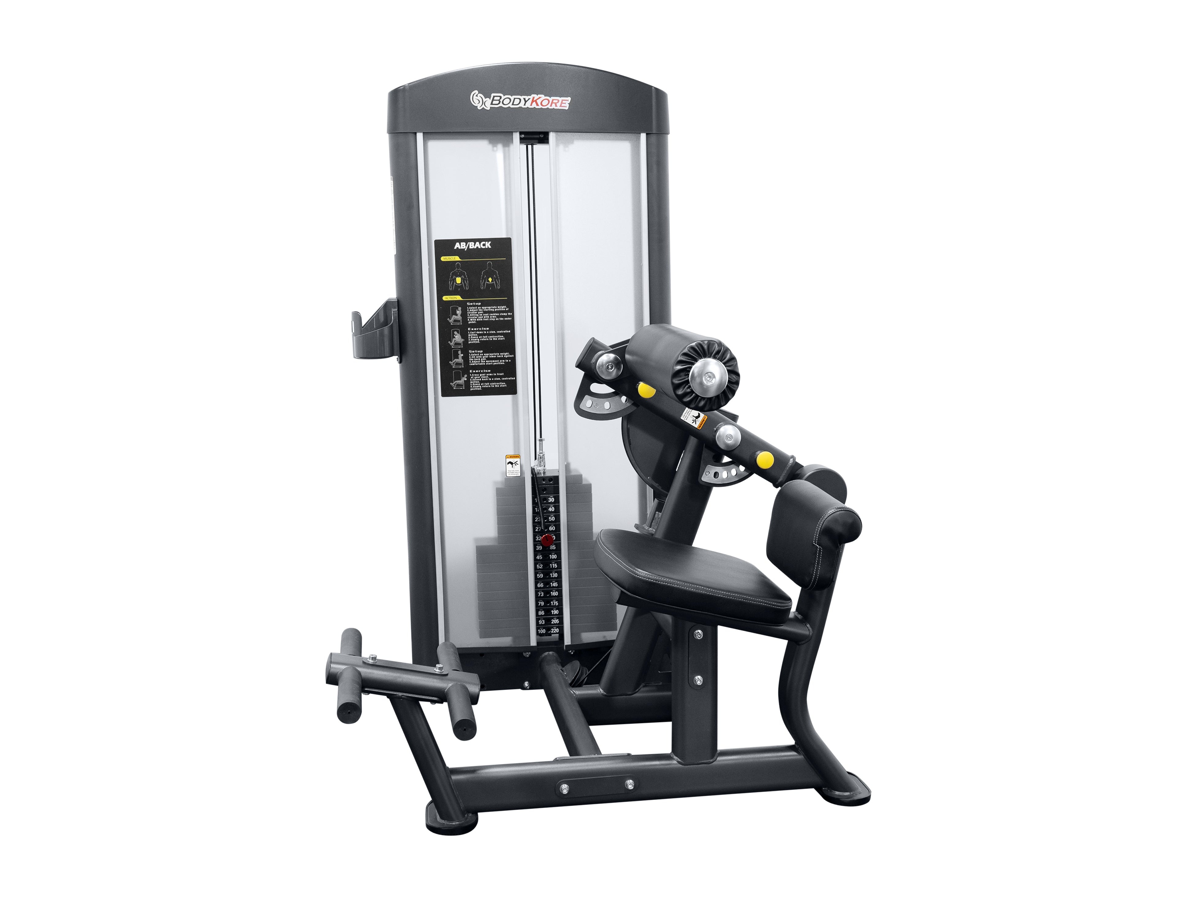 The BodyKore Isolation Series Abdominal/Back Extension machine is a user-friendly machine that targets the mid-section of the users. The dual movement machine can target the abdominal muscles with the crunch workout or the lower back with the back extension. This machine is commercial grade and rated to hold over 1000lbs.
