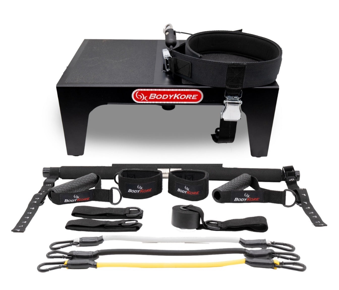 The BodyKore squat box is built for that reality. It turns a small footprint into a serious lower-body and full-body strength station. It’s a compact metal platform with a rotating pulley underneath that anchors resistance from below using bands or a cable system. Pair it with the On-the-Go Resistance Training Kit, and you unlock 100+ exercise options—at home, on the road, or inside a studio.