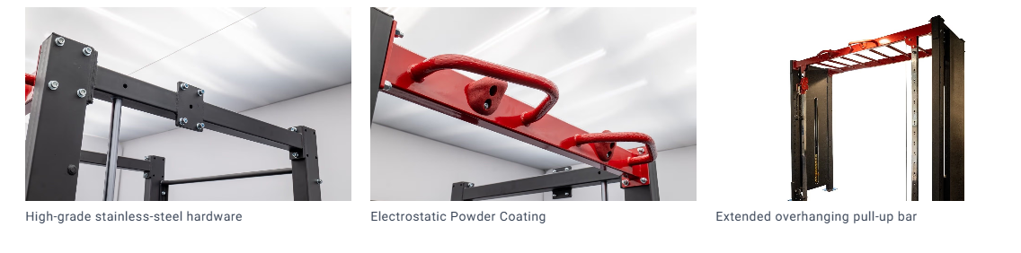 The extended overhanging pull-up bar adds bodyweight work. It does not steal floor space. Use it for pull-ups, hangs, and core work.