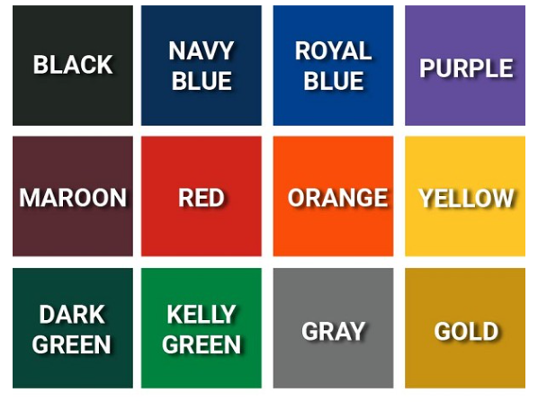 Available in: Gray, Black, Navy Blue, Royal Blue, Dark Green, Kelly Green, Maroon, Red, Orange, Yellow, Purple, Gold