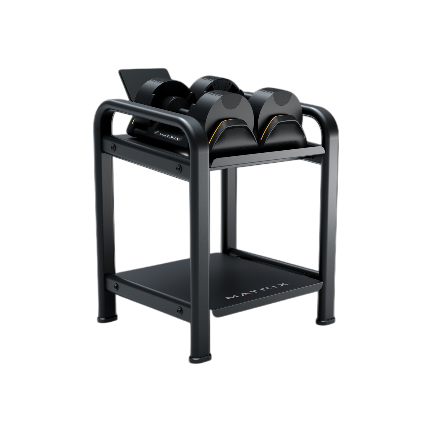 This optional storage rack elevates dumbbells for easy access and to reduce clutter. An integrated device holder makes it easy to keep workout programs and entertainment in view, while a lower storage shelf makes room for accessories like bands, mats and more.