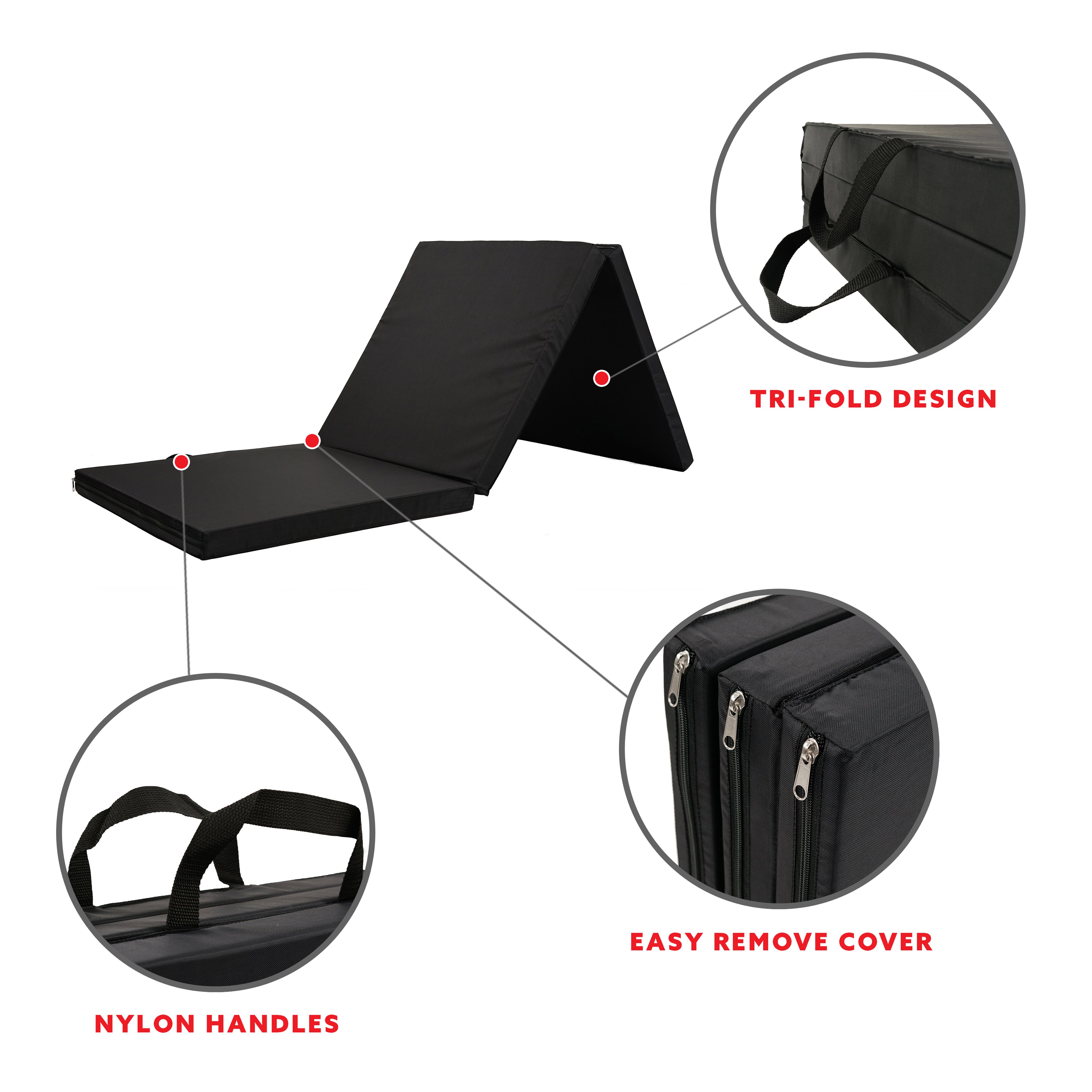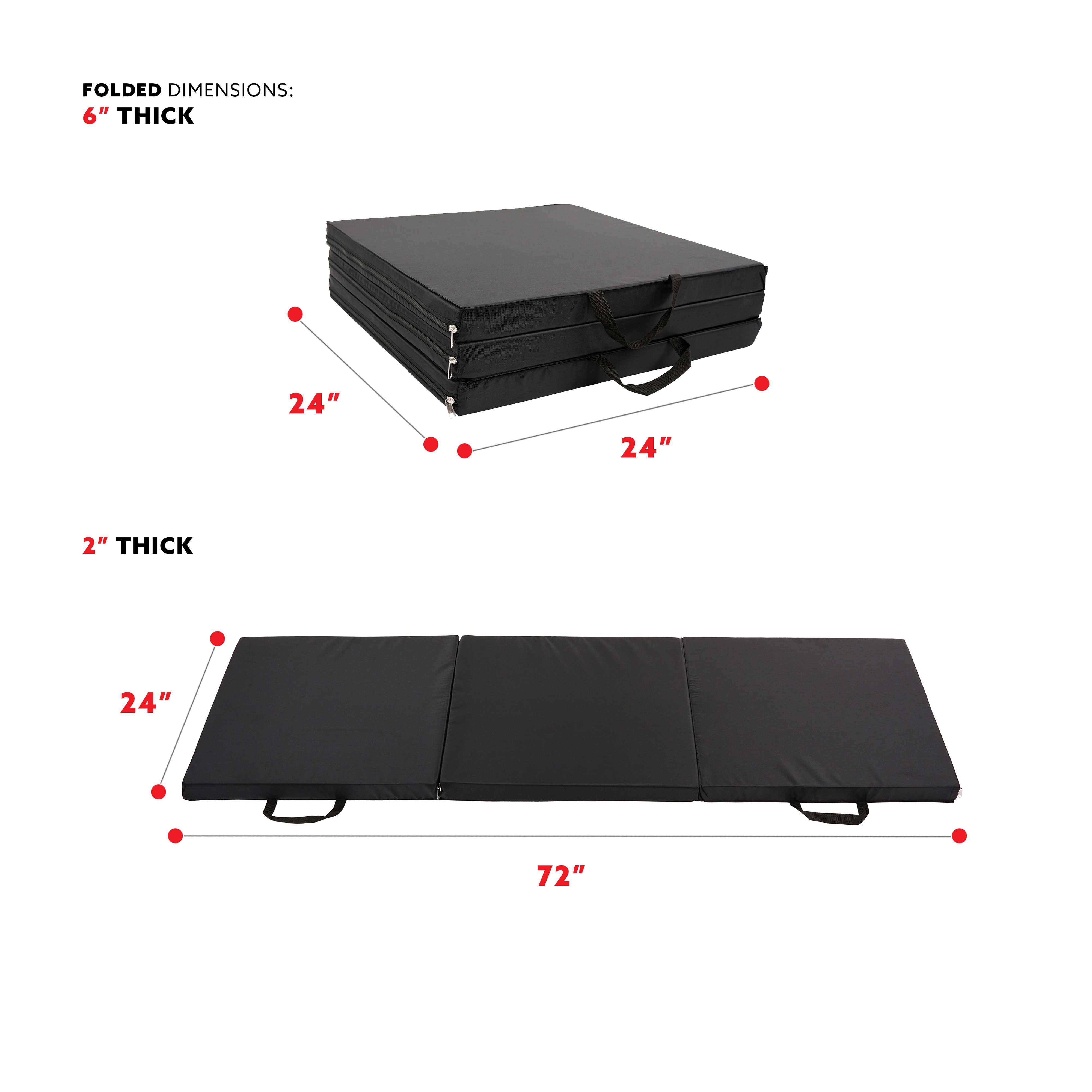 If you've ever stretched or exercised on a hardwood floor, you know just how uncomfortable it can be when sitting, kneeling, or trying yoga and Pilates exercises. Whether you're at home, the gym, or the beautiful outdoors, don't let the hard ground stand in the way of your fitness routine. The Sunny Health & Fitness No. 048 Tri-Fold Exercise Mat will help keep you fit and flexible, making various forms of training possible to do anywhere, anytime! • TRIFOLD MAT: This exercise mat helps ensure that exercises, such as stomach crunches and leg extensions, are carried out on adequate cushioning for the back, particularly the spinal cord. This design ensures that your movements’ momentum isn't lost while still providing substantial shock protection. At 6-feet in length (72L x 24W), it allows most users to lie down comfortably while doing abs workout, planks, and long duration yoga poses. • LIGHTWEIGHT & PORTABLE: Integrated two-carrying nylon handles make transportation convenient, and the tri-fold design is compact to fit easily into closets, car trunks, or storage units at the gym. • COMFORTABLE PADDING: Features 2-inch padding for extra comfort and support during a variety of training exercises, ideal for activities and exercises such as yoga, core strengthening, stretching, Pilates, and martial arts. • VERSATILE: Ideal for all skill levels, beginners to advanced, and exercising at home or in the gym with the team. This is also perfect as a spare bed, or as a floor mat, yoga, Pilates or exercise mat, futon mattress, or for a children's play area. • CONVENIENT NYLON STRAPS – Grip the slip-resistant bands to carry your yoga mat on the go! No need to struggle with carrying the entire mat in your arms. • Assembled Product Dimensions: 72L x 24W x 1.8H in • Assembled Product Weight: 3.97lbs