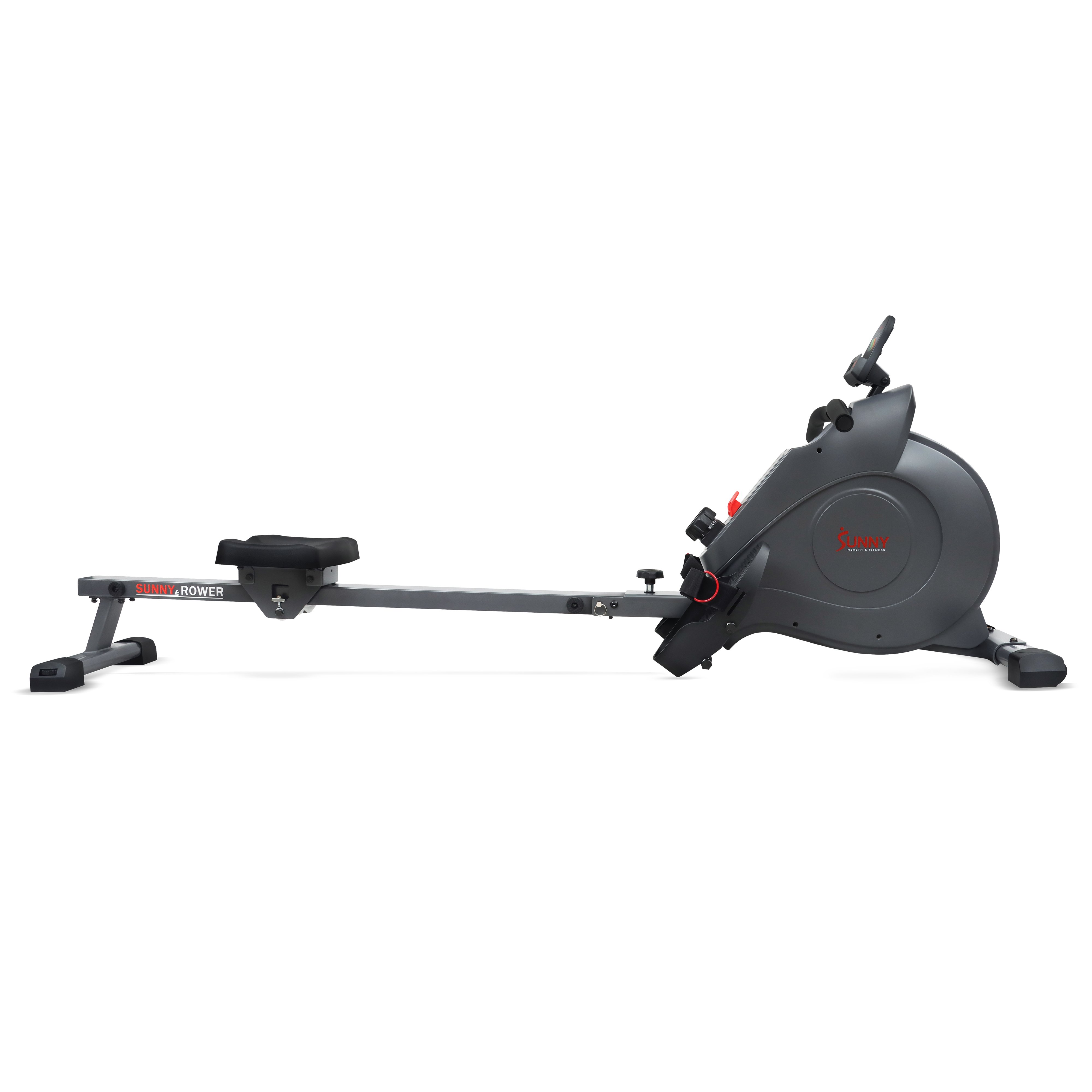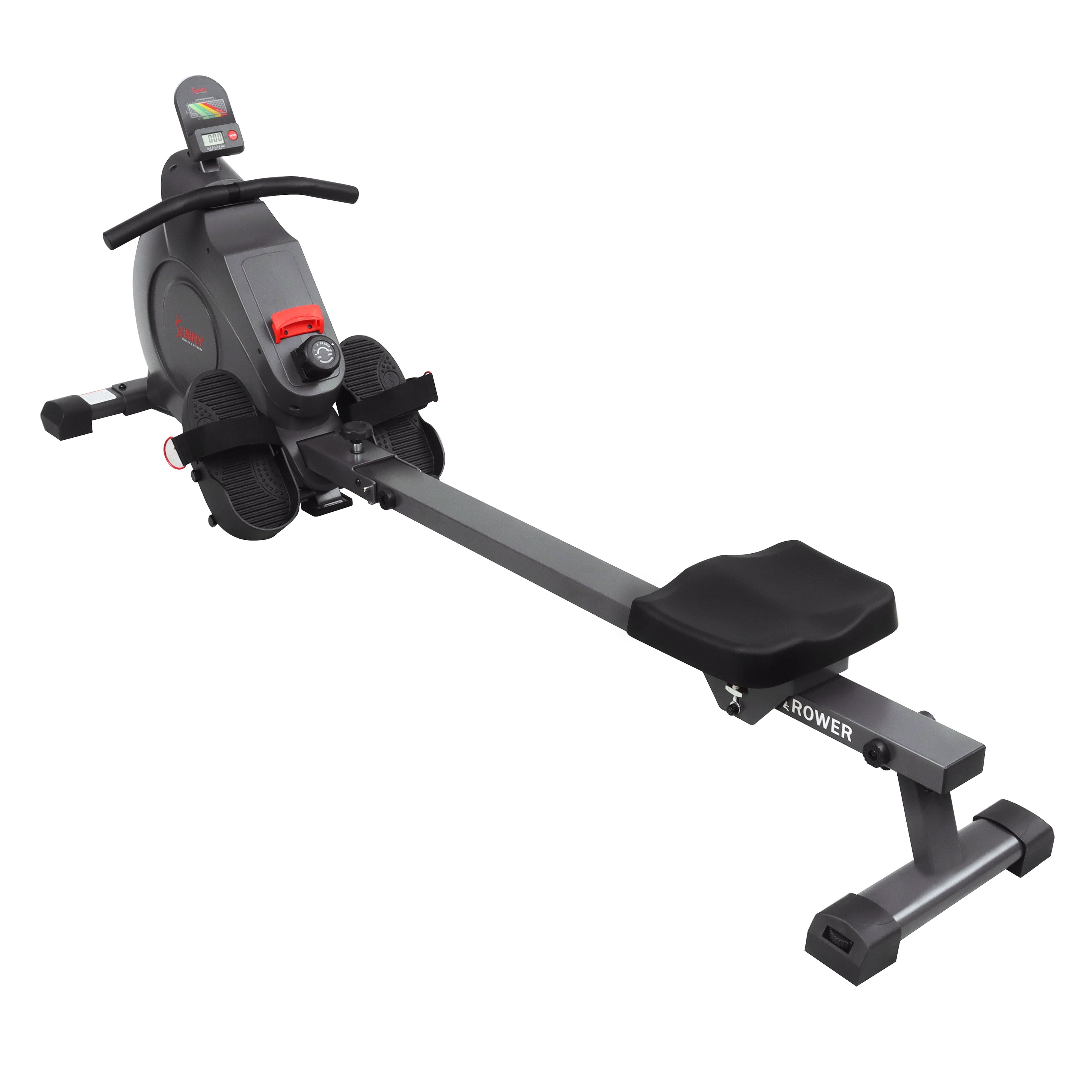 Row into shape with the top-of-the-line Sunny Health & Fitness Magnetic Rowing Machine! Connect your rower via Bluetooth and start rowing with our certified trainers through our SunnyFit® App! This rowing machine offers all of the necessities for an intense yet enjoyable rowing workout in the comfort of your own home. Designed with a newly improved, smoother, quieter magnetic tension system, this rower comes with 8-levels of adjustable tension. Other features include a convenient and large LCD console, a fully padded seat, larger anti-slip foot pedals, 2 device holders, and built-in transportation wheels. The Sunny Health & Fitness Magnetic Rowing Machine with LCD Monitor is designed for convenience while also providing the challenging feeling of an outdoor rowing experience. The quality of its heavy-duty steel frame is built for durability and to support users of all skill levels and body types. This indoor rowing machine is built based on our popular SF-RW5515, a product that hundreds of thousands of satisfied customers can vouch for. • DIGITAL MONITOR: The large LCD console displays time, count, calories, total count, and scan. The convenient scan mode displays your progress to assist you in tracking all your fitness goals. • EXTRA LONG SLIDE RAIL: At 51.2 inches for the slide rail length and 46.5 inches for the inseam length, the SF-RW522016 can accommodate for nearly any body type. • ADJUSTABLE MAGNETIC RESISTANCE: With a simple twist, you can increase or decrease the 8-levels of magnetic resistance, so your workout can remain challenging and effective throughout your fitness journey. • SMART FITNESS: Cycle along with Sunny Health & Fitness expert trainers on the Sunny Health & Fitness SunnyFit® App. Connect your preferred mobile device through Bluetooth and view your performance metrics in real-time. • SUNNYFIT® APP: The all-new SunnyFit® App takes your Sunny workouts to the next level! View your live metrics displayed in real-time as you tour the world with real location maps. Get the results you want with customized workout plans. Explore 100+ workout videos that fit your schedule and goals. • DEVICE & TABLET HOLDER: Follow along to your favorite Sunny Health & Fitness training videos on your tablet or mobile device. • TRANSPORTATION WHEELS: Built-in transportation wheels for easy portability. Simply tilt and roll out for use or away for storage, no need for heavy lifting or muscle strain. • Assembled Product Dimensions: 81.7L x 19.9W x 28.5H in • Assembled Product Weight: 62.9lbs