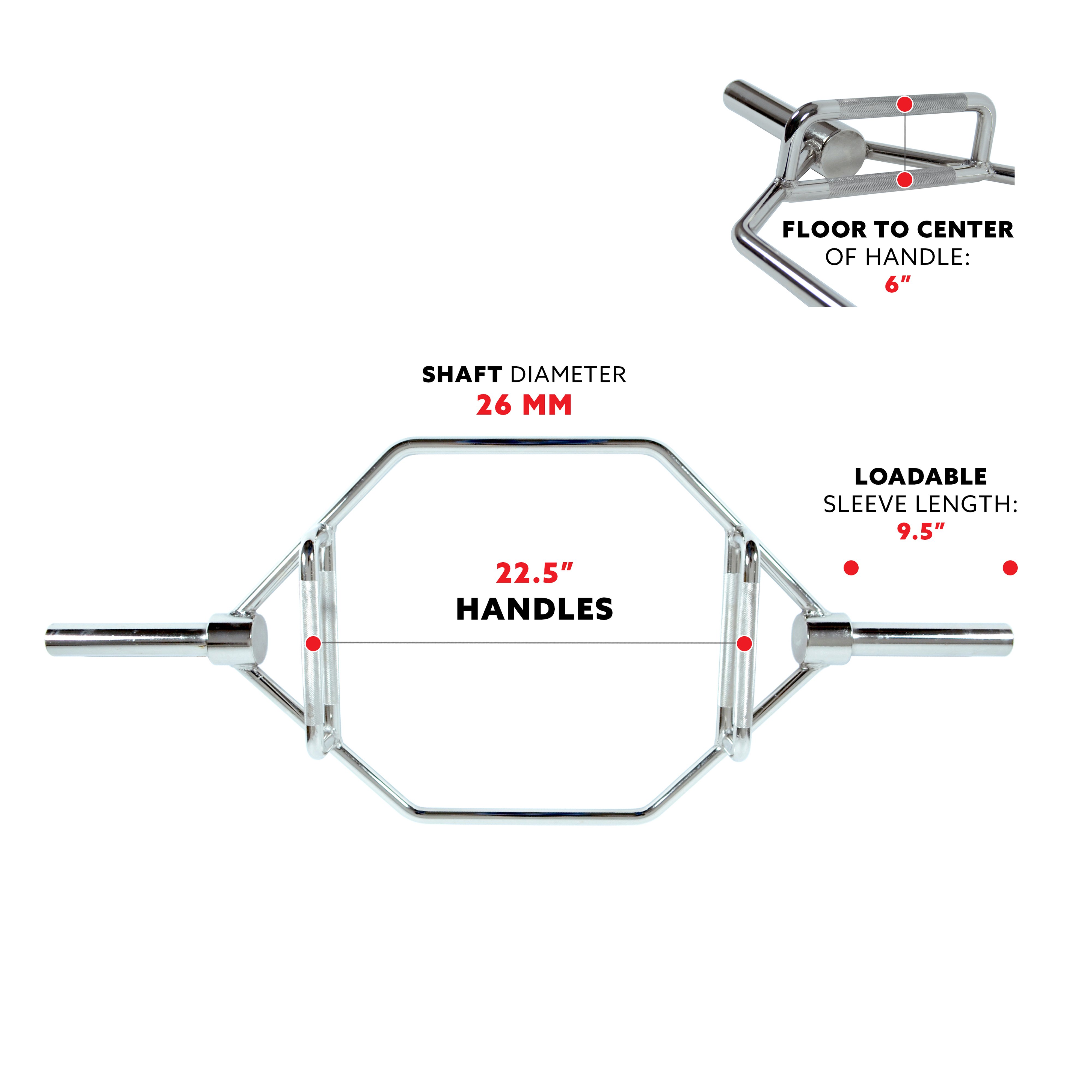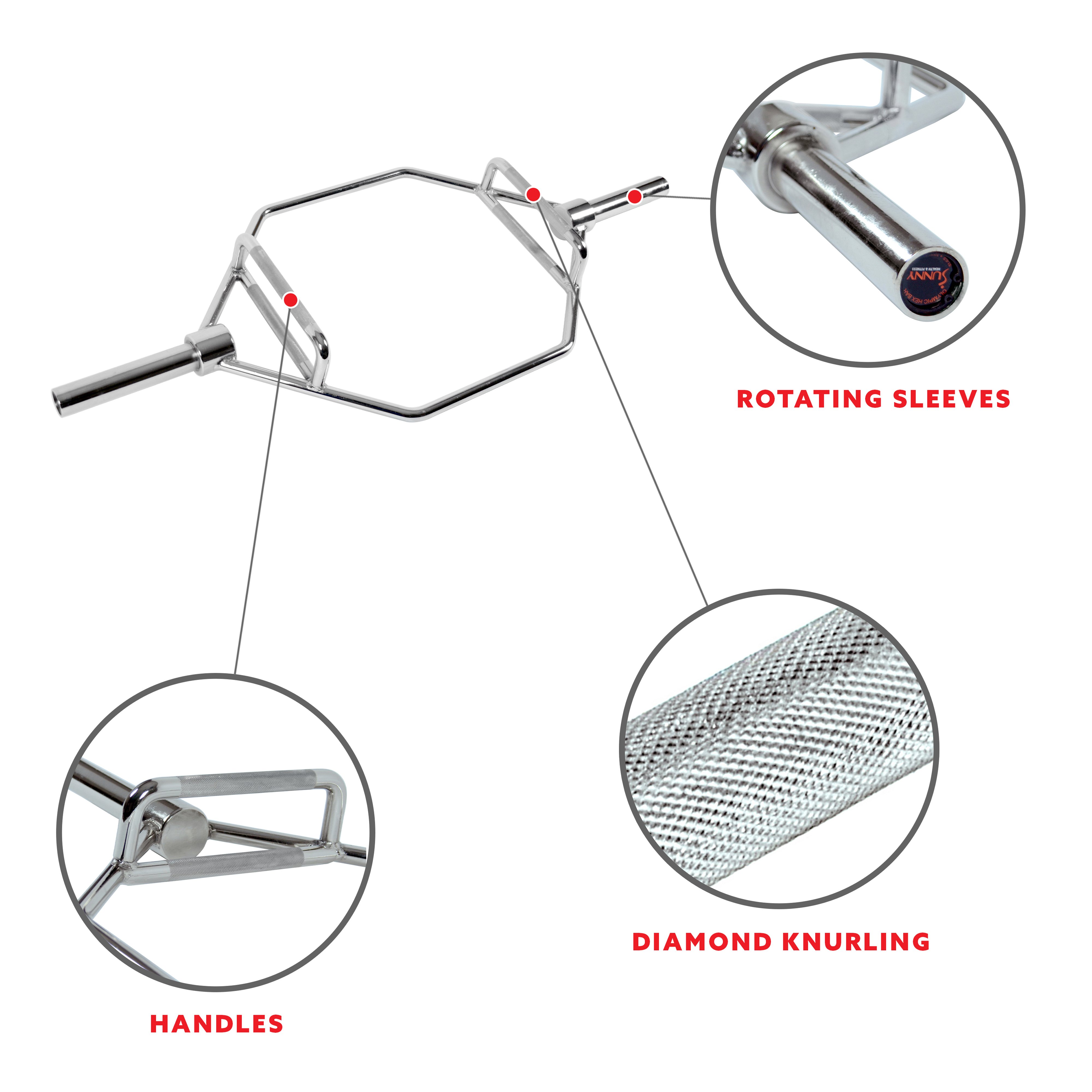 Lift weights and build muscles better, faster, and safer with the Sunny Health and Fitness OB-Hex Bar by Sunny Health and Fitness. Unlike traditional bars, the hex bar provides a safer, more efficient way to perform deadlifts. Don't be afraid to load up because this weightlifting bar allows you to support a higher max weight. Accommodates 2” weight plates. The bar is designed to put more pressure on your quad muscles and less on your lower lumbar spine. It’s all about the center of gravity and having the mechanical advantage, the bar allows for optimal positioning of the head, back, hands, and arms to perform squats like a champ while reducing the amount of strain on the knees, hip, and back. The handles are diamond knurled for a solid grip and comfort. you'll also feel more control while still performing safer and better lifts as you're directly in the center of the bar. The ample 9.5" of loadable sleeve space makes this bar versatile in any strength program. you can work it hard and keep it safe with Sunny Health and Fitness OB HEX bar! Triple extension baby! • The diamond knurled handles are comfortable so you won't shred up your hands while lifting. Knurling is optimal for supplementing your grip strength and helping correct hand placement. • Easy on, easy off - quick-release ring collars are very easy to use with the fast install and quick release action to make your workout more efficient. Accommodates 2” weight plates • The special design of the quick-release ring collars ensures secure plate fixation for stability and safety while protecting the bar finish. • The Olympic bar holds weights up to 750 lbs. with a loadable sleeve length of 9.5-inch inches. Promotes better control while maintaining stability without added pressure on the back. • Handles 22.5" on center and 6" from floor to center of handle with 26mm shaft diameter (1.10 inch). Diamond knurled handle for secure comfortable grip • Assembled Product Dimensions: 56L x 23W x 6H in • Assembled Product Weight: 51.4lbs