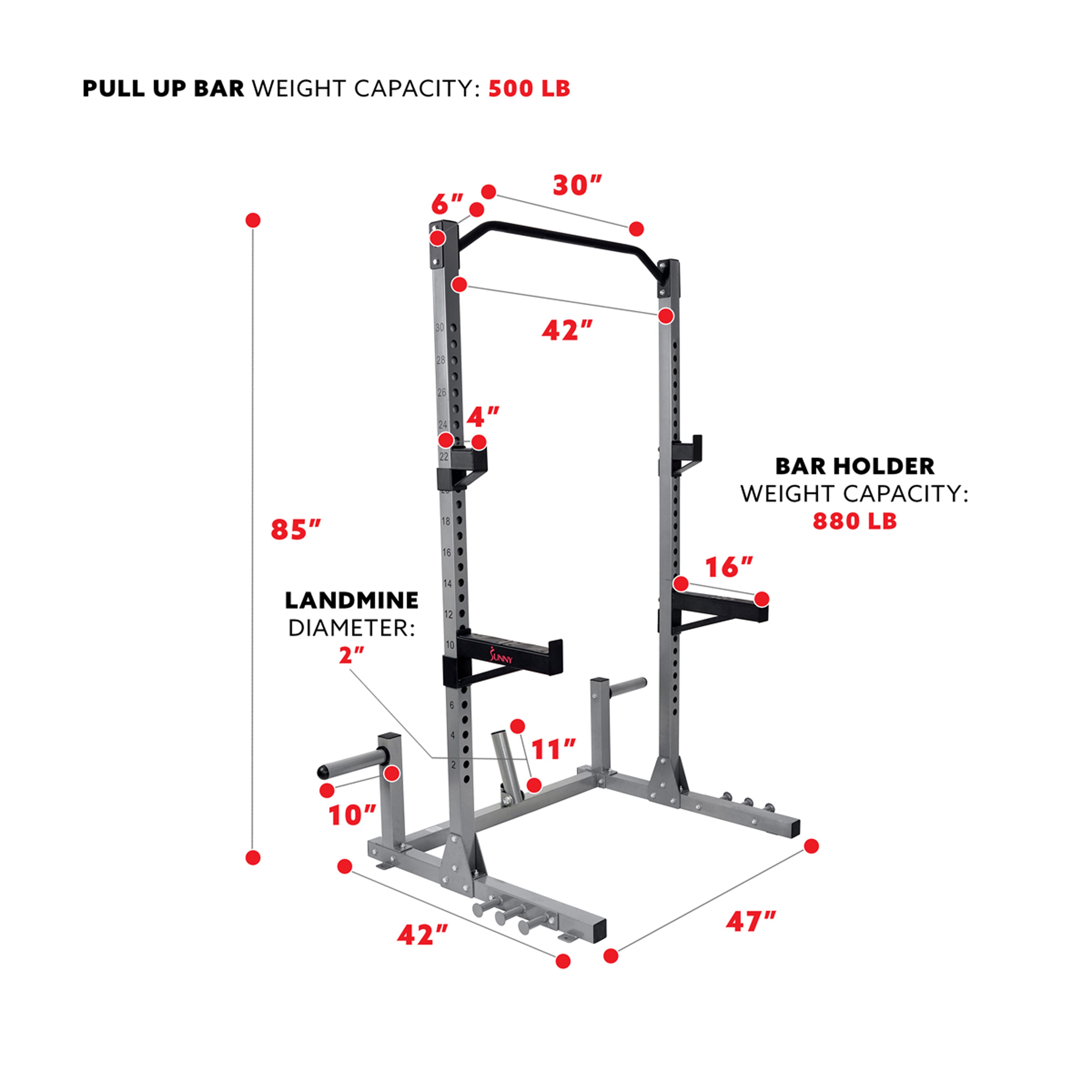 Take your home gym to the next level with the Sunny Health & Fitness BH6802 Power Rack. The full functional power rack is designed with a small footprint in mind to tackle the big workouts of the day. Combine the Sunny Health and Fitness bars and bumper plates and perform workouts to target and strengthen muscles across your body. The powder-coating, durability, and utility are designed seamlessly into the power rack to fully support weight and powerlifting workouts. The compact Gym Rack lets you work out right in the comfort of your own home or garage. The result; a fully loaded power rack with features such as the included 360° swivel built-in landmine post, raised height to pull up bar, exercise band attachment points, durable J-hook and Spotter arms, as well as more than 30 adjustment points to fit people of all sizes. The squat rack is built with ample room to provide easy side-to-side movement. Now you can perform squats, curls, shrugs, pull-ups, push-ups, and more. you take away; a well-designed and small footprint rack that will help you build the Rome that is your body. We all know Rome wasn't built in a day, your body won't be either, but the Sunny Power Rack will help you get there one day at a time. Whether you're an experienced powerlifter/bodybuilder or someone just starting on their strength training journey, this power rack can keep up. Unleash your inner beast with the SF-BH6802 Power Rack by Sunny Health and Fitness. Hardware peg hole diameter: 1 in. • HEAVY DUTY FRAME: Supports up to 880 lb Product Dims. (42 L X 47 W X 85H inches) Easy Assembly with bolt together design. • VERSATILE: Included landmine barbell attachment for greater utility and usage during resistance training exercises like landmine squats, lunges, rows, and rotational exercises such as landmine standing anti rotations. • KNURLING: Knurled Grip on Pull up Bar providing extra grip in strenuous/slippery workout sessions. Exercise band attachment points to better increase strength and endurance. • CONVENIENCE & SAFETY: 16” spotter arms for ease of mind and safety assurance when squatting with heavier weights. • OLYMPIC PLATE STORAGE: Easily organize weights on rack while adding extra stability when utilizing the machine. Freestanding design with optional bolts in brackets for stability and versatility. • Assembled Product Dimensions: 42L x 47W x 85H in • Assembled Product Weight: 117.95lbs