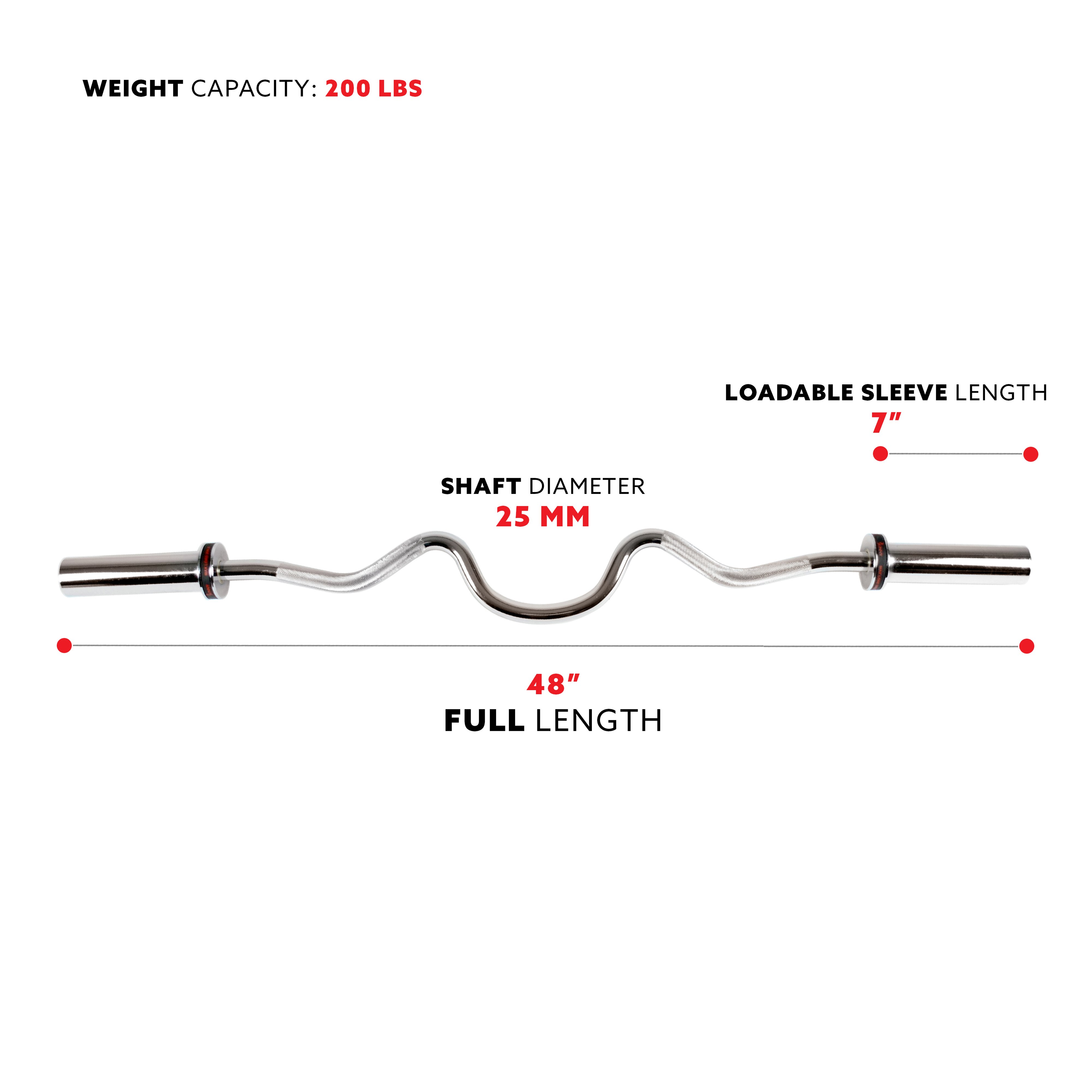Strengthen your arms with the OB-48 Olympic Super Curl Bar designed to put your hands in multiple positions that target muscles in the forearms and biceps. The bar has more prominent curls in the handle to allow for more forearm rotation which works the smaller muscle groups in the arms. The bar has a maximum load capacity of 200 lb and includes locking ring collars for safety and security. This is a proven favorite for bodybuilders everywhere because it gets results. • Holds weights up to 200 lb. • Rotating sleeves allow the weight plates to rotate as you move the bar. This provides a more secure grip and reduces stress on your wrists and elbows • Locking Ring Collars to keep everything secure and in place for stability and safety • Diamond knurled handle for solid gripping while you train • Accommodates Olympic weight plates with 2-inch center holes • Unique EZ-Bar design helps to take the stress off your wrist when doing curls. • Assembled Product Dimensions: 48L x W x H in • Assembled Product Weight: 16lbs