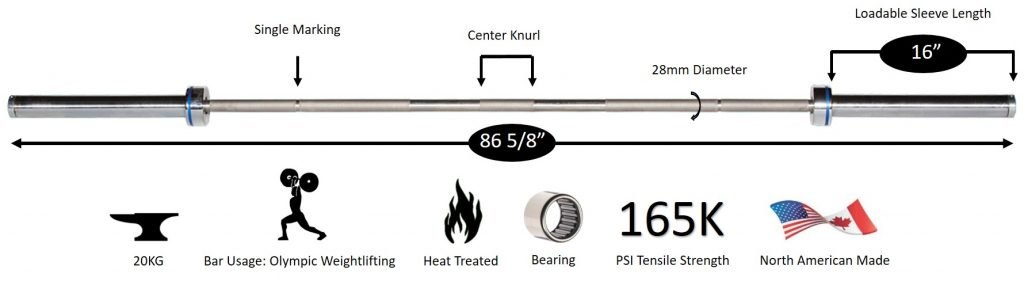 The YORK® “Elite” Olympic Stainless Steel Weight Bar has a minimum tensile strength of 165,000 PSI after heat treating.  The bar will not rust and the stainless steel is American made only North American steel is used in the making of this bar. It is flexible and an an excellent weight bar  for use when performing Olympic Lifts. The sleeve is secured on the bar using a bar end nut and spring pin. Sleeves are machined to a precise 1.975” diameter to accommodate 2” Olympic Plates.