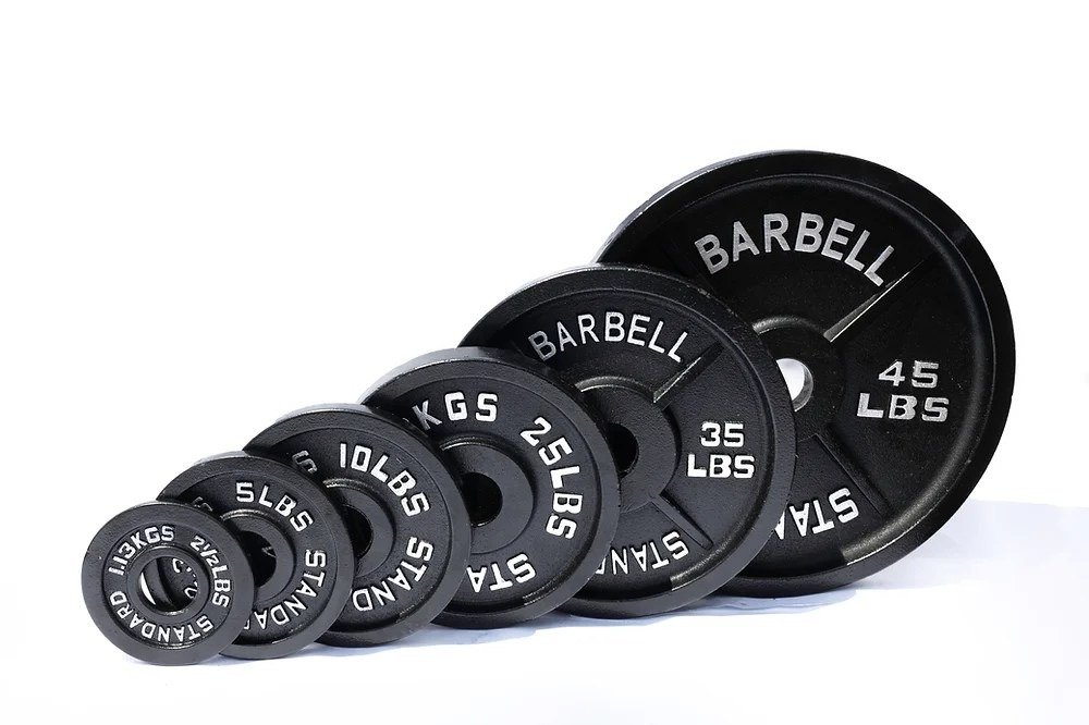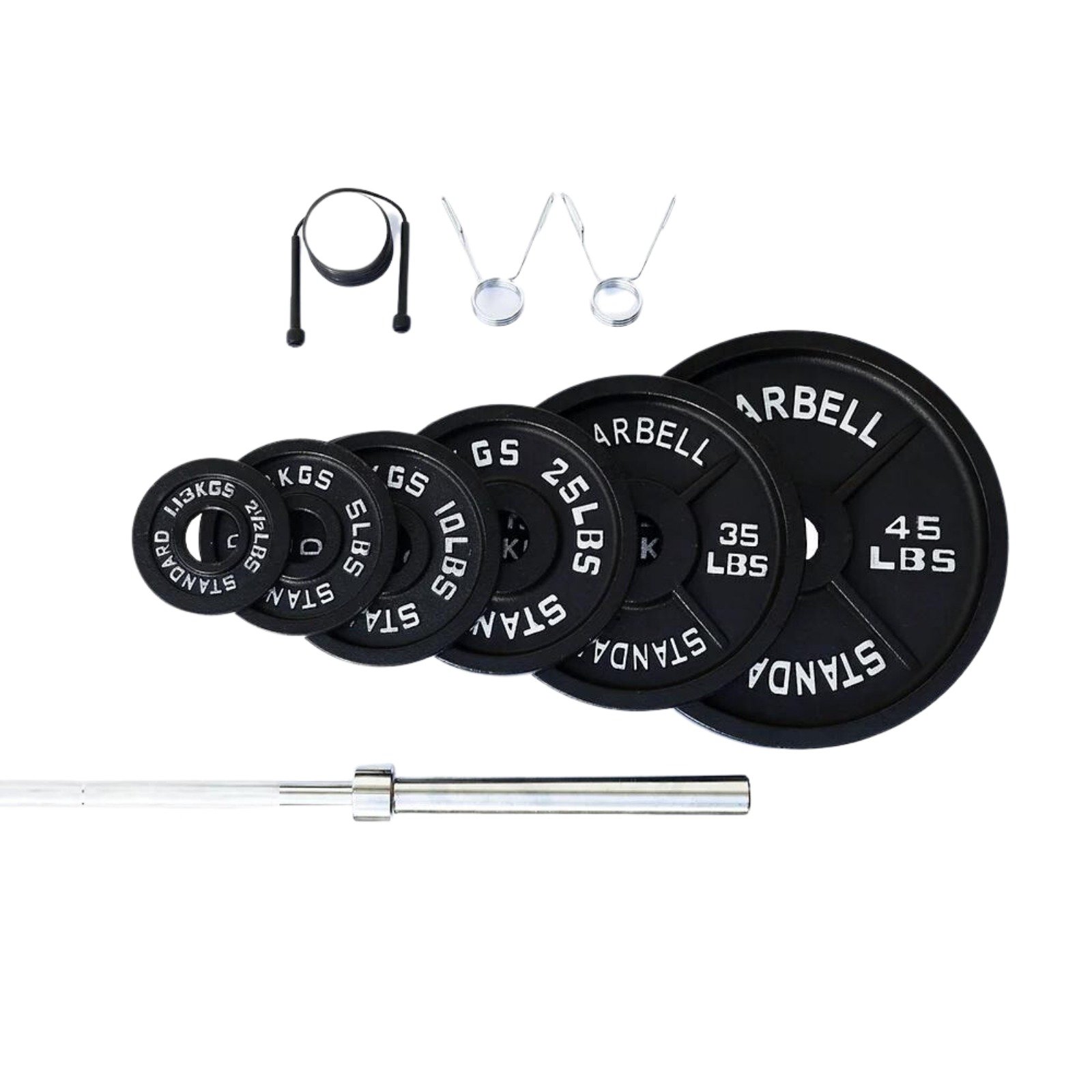 – This set includes a 7-feet Olympic bar, and the following weight plates: 2 x 45 lb, 2 x 35 lb, 2 x 25 lb, 2 x 10 lb, 2x 5 lb and 2 x 2.5 lbs.